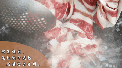 鍋里燒水,先把肥牛燙熟,然后撈出備用